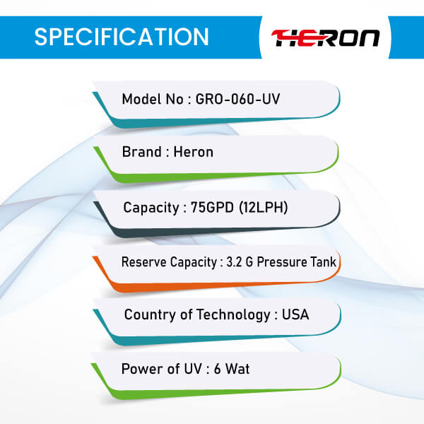 The Heron GRO-060-UV is an advanced water purifier designed to deliver clean and purified drinking water. It incorporates state-of-the-art Reverse Osmosis (RO) technology, renowned for its exceptional ability to eliminate impurities from water. The RO membrane technology used in this purifier is sourced from the USA, guaranteeing reliability and effectiveness.